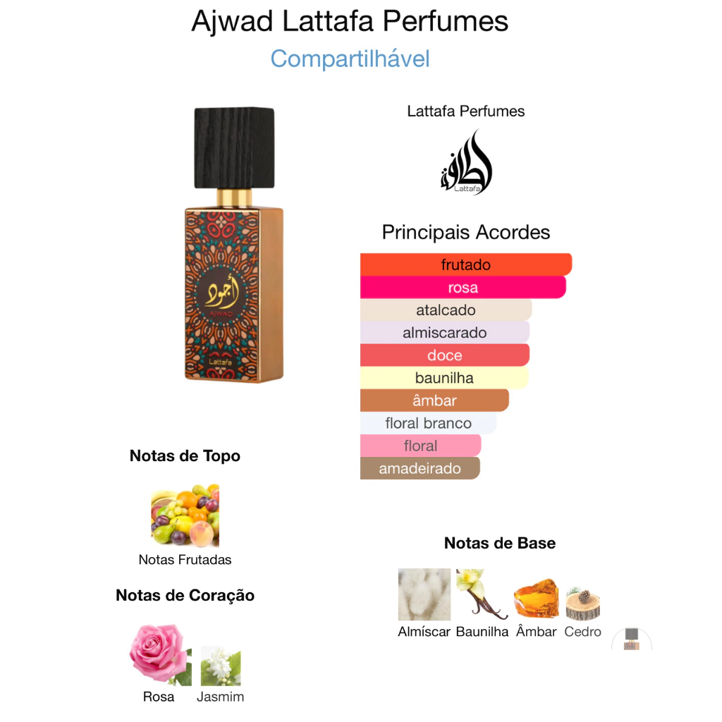 Ajwad da Lattafa é um perfume cativante e luxuoso que evoca uma aura de elegância e sofisticação.É uma fragrância oriental, perfeitamente equilibrada entre notas quentes e amadeiradas, combinadas com toques florais e especiarias exóticas.